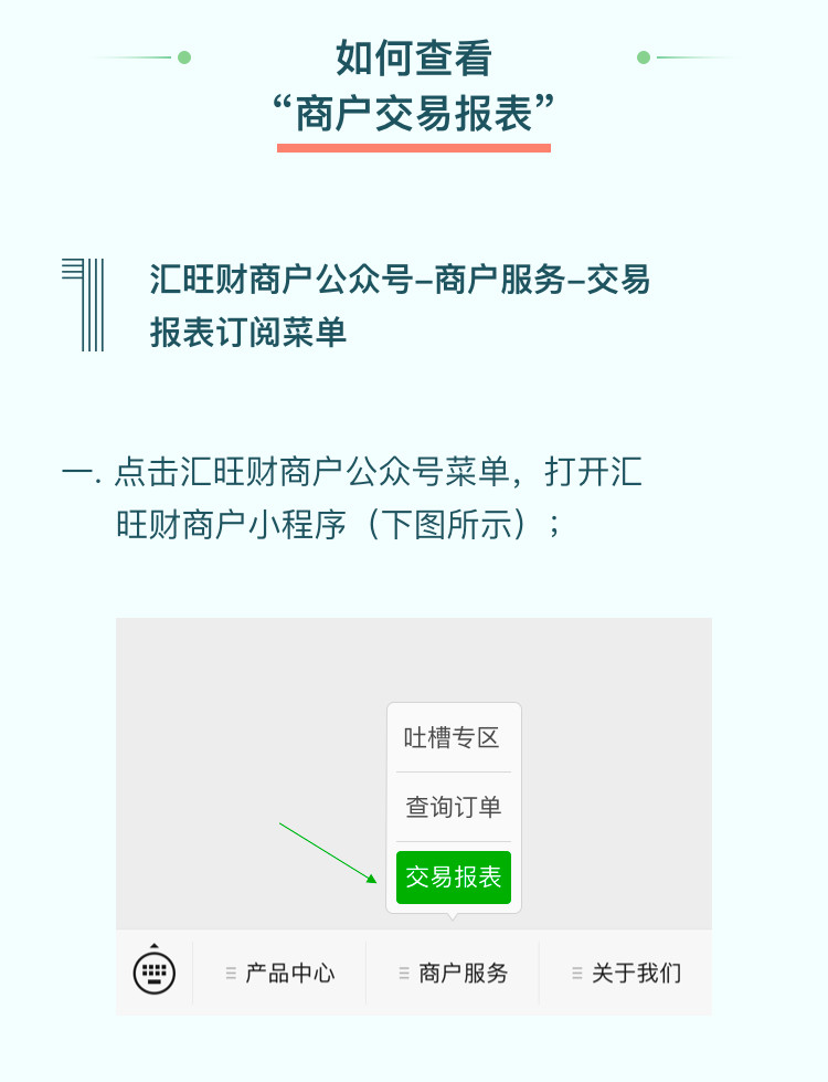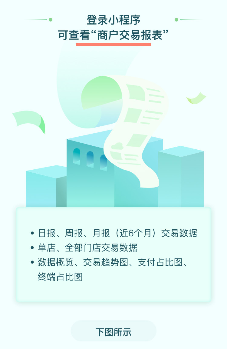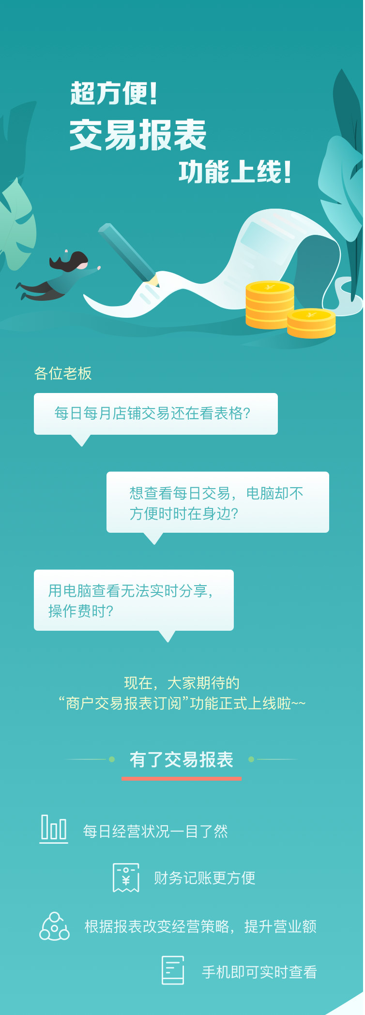 现在想查看商户交易报表,微信订阅“报表订阅”功能后,每日定时通过微信消息送达给商户。